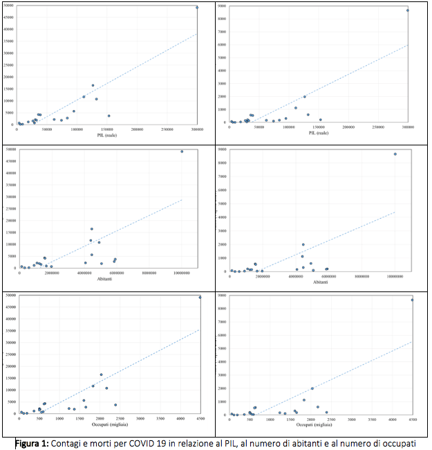 Per ogni regione d’Italia, abbiamo considerato i dati relativi ai contagi e alle morti per COVID 19 al giorno 5 aprile e il abbiamo messi in relazione al numero di abitanti, al PIL (reale) e al numero di lavoratori occupati. L’idea era di vedere in che modo le variabili demografiche e quelle economiche erano collegate ai principali indicatori sull’incidenza del virus. Come era lecito aspettarsi, se operiamo un confronto tra coppie di variabili troviamo che sia il numero di contagi sia il numero di morti sono positivamente correlati al numero di abitanti, al PIL e al numero di occupati. E’ intuitivo infatti che al crescere del numero degli abitanti crescano anche i contagi e i morti e lo stesso dicasi quando cresce il PIL oppure quando sale il numero degli occupati in quanto sia la produzione sia il lavoro comportano la sussistenza di relazioni che possono incrementare il diffondersi della malattia. Queste relazioni positive sono illustrate nei sei pannelli della Figura 1.