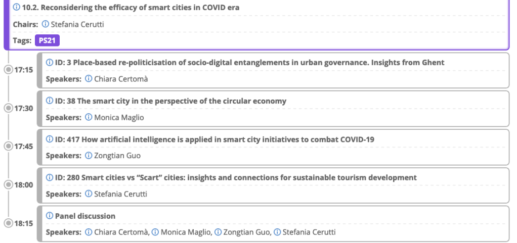 My presentation will be held during session 3 “Reconsidering the efficacy of smart cities in COVID era”, organised by Stefano de Falco (University Federico II of Naples), Margarita Angelidou (Aristotle University of Thessaloniki), Stefania Cerutti (University of Piemonte Orientale).