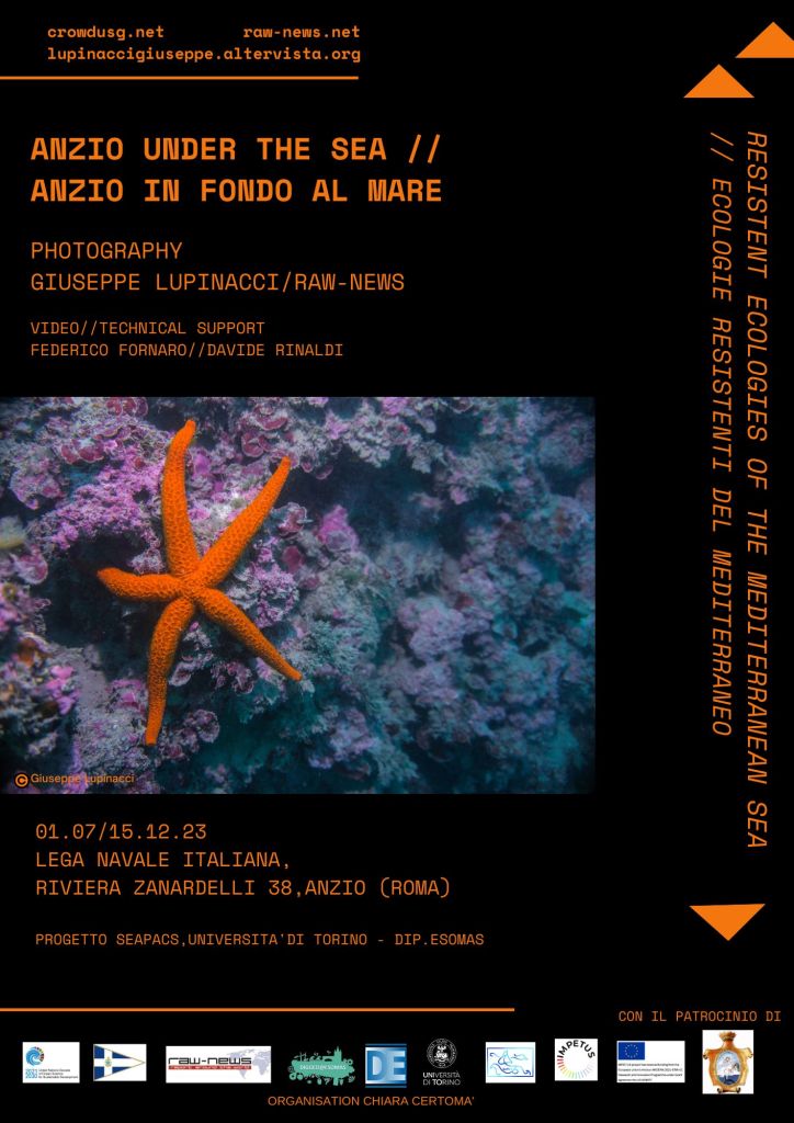 La società di video documentazione Raw News (fotografia Giuseppe Lupinacci, video-making Federico Fornaro), con il supporto del “Capo D’Anzio Diving Certer” (Davide Rinaldi) presenta una nuova mostra fotografica dal titolo “Anzio sotto il mare. Ecologie Resistenti del Mediterraneo”, presentando in 10 scatti gli organismi biologici resilienti che stanno resistendo alle mutate condizioni oceaniche, a causa di molteplici problemi di origine antropica (aumento della temperatura superficiale del mare, tropicalizzazione, acidificazione degli oceani, perdita di ossigeno, inquinamento da plastica per dirne alcuni). La mostra sarà accessibile per tutta la durata del progetto SeaPaCS presso la Lega Navale Italiana Anzio.