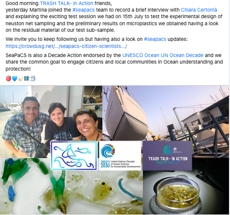 Within the European project SeaPaCS – Participatory Citizen Science against Marine Pollution, the research team is dealing with and implementing the two main research deliverables which include: