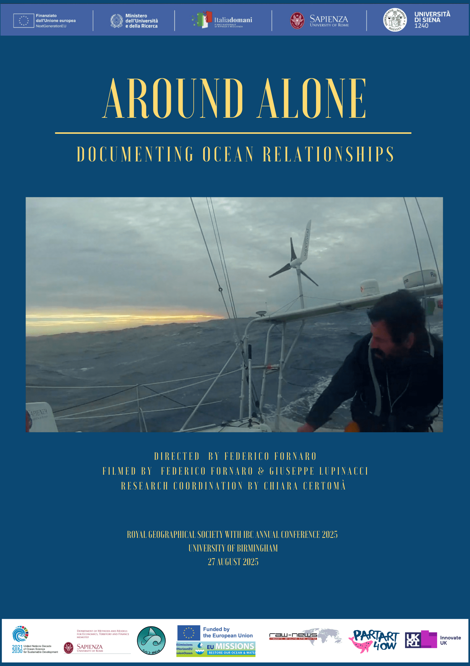 On the 27th of August 2025, Chiara Certomà (Sapienza University of Rome, MEMOTEF Dep.) and Federico Fornaro (Raw-News Visual Production Agency), research team CO>SEA, presented the premiere of the new short-documentary “Around Alone. Documenting Ocean Relationships” at the Royal Geographical Sociaty with IBS Annual Conference 2025 (RGS AC2025), University of Birmingham, “Film Geography” session.