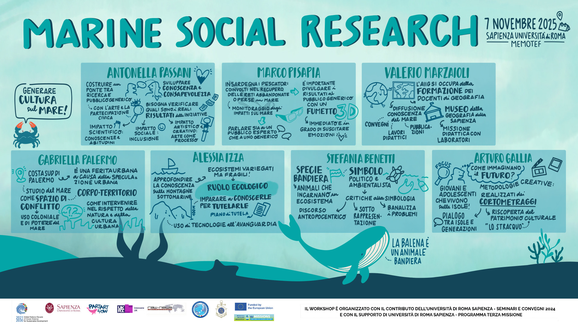 The CO>SEA research team invites eveybody to join the creative workshop “Marine Social Research. Present and Future of science, creativity and participation for the Ocean” that will be held on the 3rd of October 2025 at Sapienza University of Rome, MEMOTEF Dep (via del Castro Laurenziano 9, Rome). The worshop is part of the EU Horizon project PartArt4OW and included in the activities of the CO>SEA_Lab project.