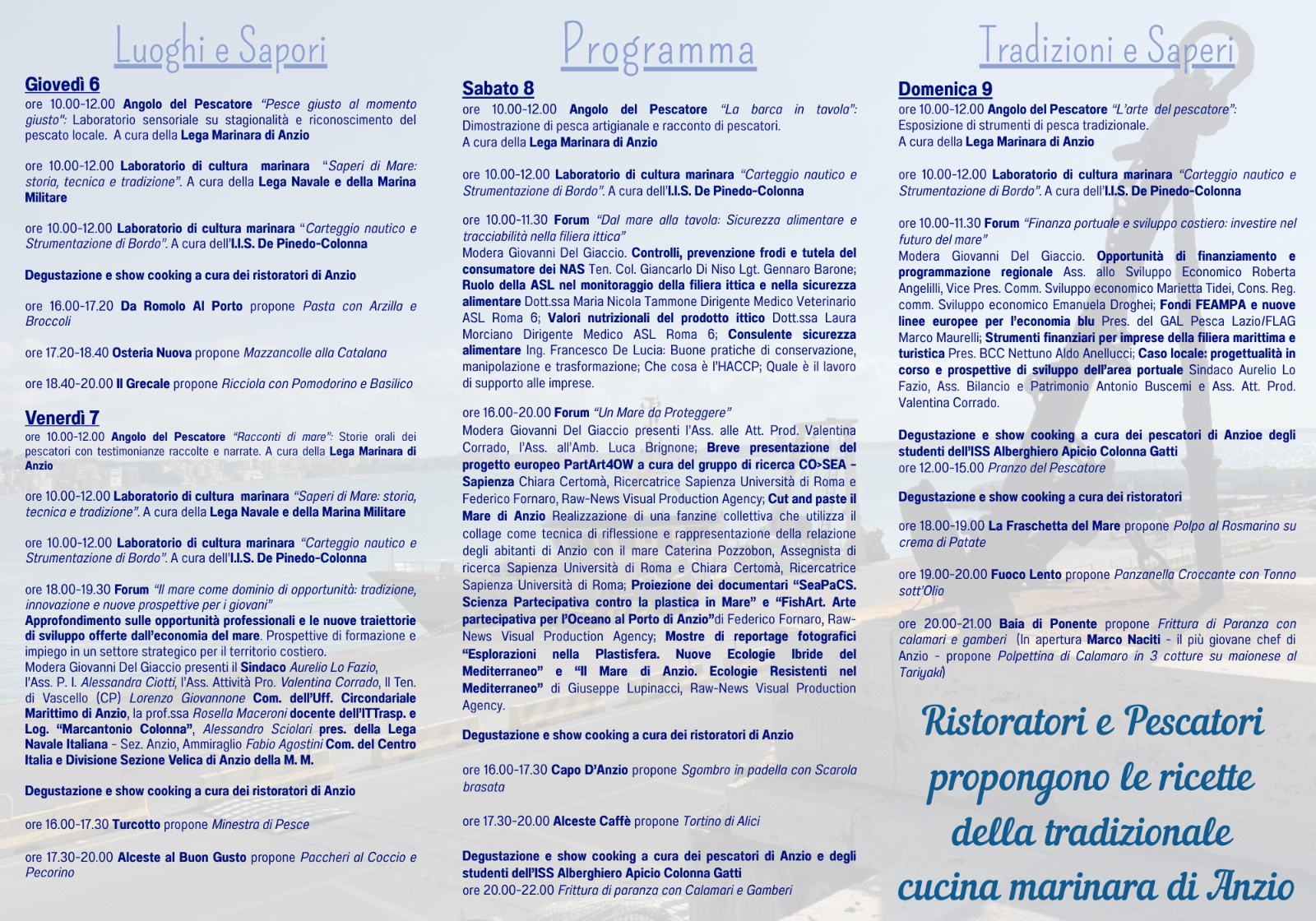 - Presentations and exhibitions at “Sapore di Mare”, FEMPA – GAL Lazio – Comune di Anzio https://ilclandestinogiornale.radioroma.it/ultime-notizie/208701/grande-attesa-per-sapore-di-mare-ecco-il-programma-dei-4-giorni/