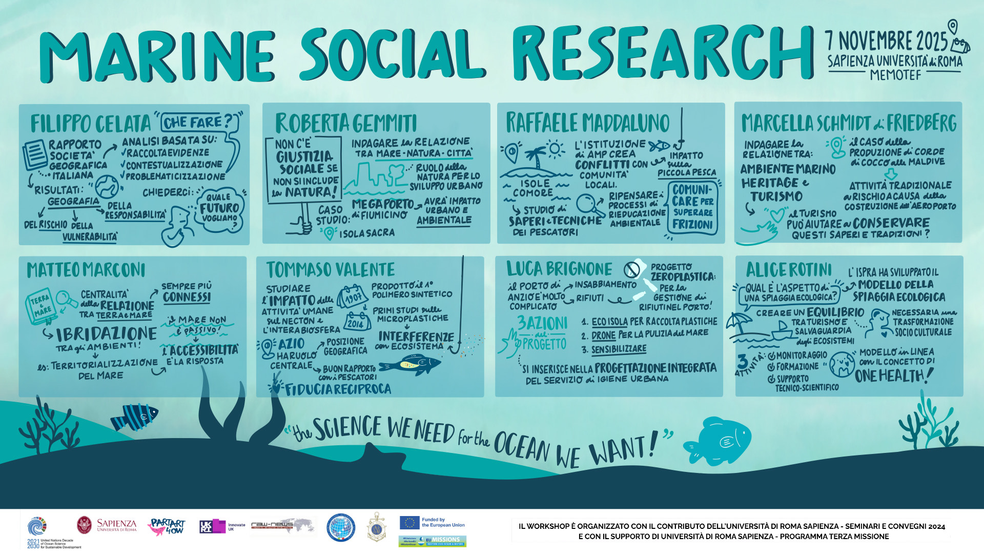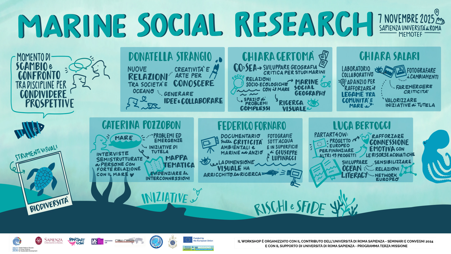 - 30 Oct 2024 Granted the support for the workshop “Marine Social Research. Present and Future of science, creativity and participation for the Ocean” by Sapienza University of Rome – “Bando Convegni Seminari e Workshop“.