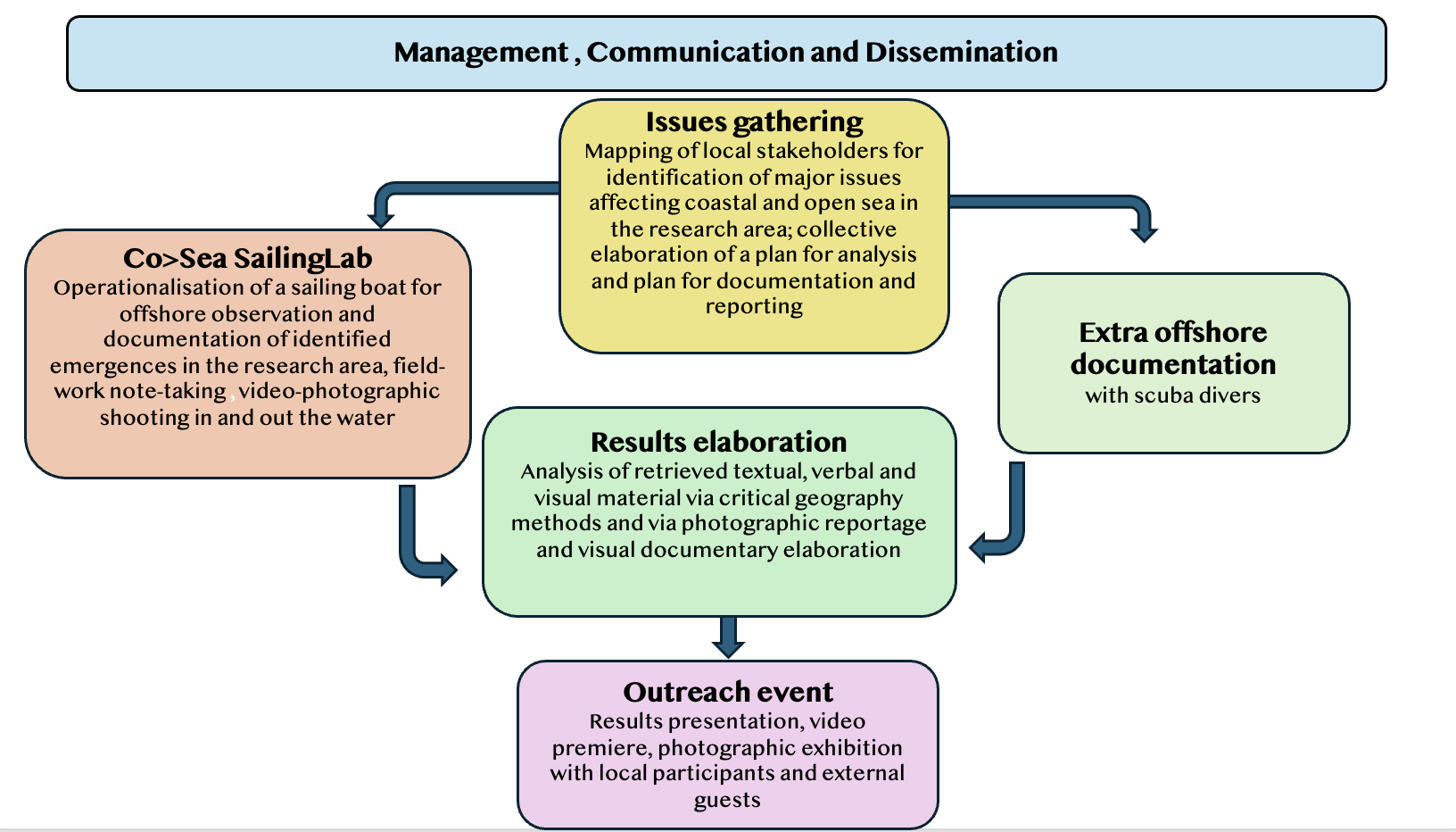 - Co>Sea SailingLab. Operationalisation and testing of sailing lab by project leaders for marine observation and documentation of identified emergencies in the research area to fine-tune the marine social geography and visual research methodology. This includes brainstormig and writing for follow-up elaborations, internal assessment of conducted research and evaluation of team performances.