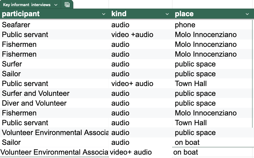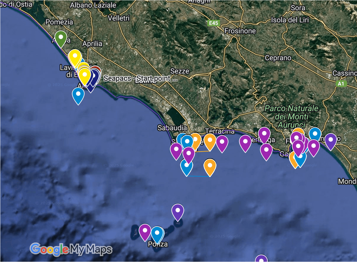 - January-March 2025 CO>SEA tram interviewed gate-keepers and stakeholders in the city of Anzio to identified via a participatory marine social geography process the principal emergences affecting the coastal sea and the coast of the Gulf of Anzio. Over 10 in-depth, open and long interviews (30 min- 1.5 hour) have been conducted, recorded or video-recorded (by Raw-News), unsploot and ready for content mapping and semantic analysis. Interviewed citizens (including seaworkers and seafarers, administrators, seagoing people, associations…) have been asked main problems of the coastal sea and the high seas in the area (notably in the Gulf of Anzio up to the Pontine Islands), how the crucial issues for the health of the global oceans in your experience impact the local sea; what actions undertaken do you know (e.g. safeguard/care practices implemented by the inhabitants).