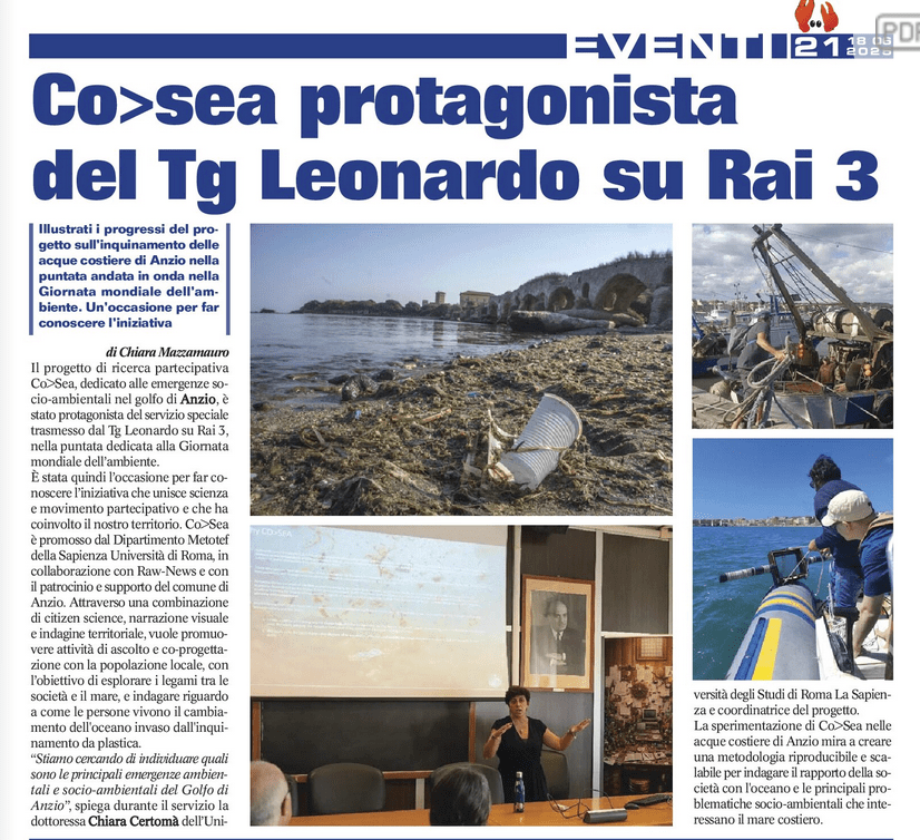 [english below] Il mare di Anzio raccontato dal TG Leonardo, RAI 3 – Protagonista il progetto CO>SEA Il progetto di ricerca partecipativa CO>SEA, dedicato alle emergenze socio-ambientali nel Golfo di Anzio, è stato protagonista di un servizio speciale trasmesso dal TG Leonardo su Rai 3 il 5 giugno 2025. Il servizio, a cura di Laura…