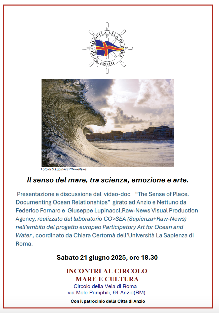 - 21 jun 2025 Presentation of short video-doc “The sense of place. Documenting Ocean Relationship” at the Circolo Vela Roma, Anzio (Italy)