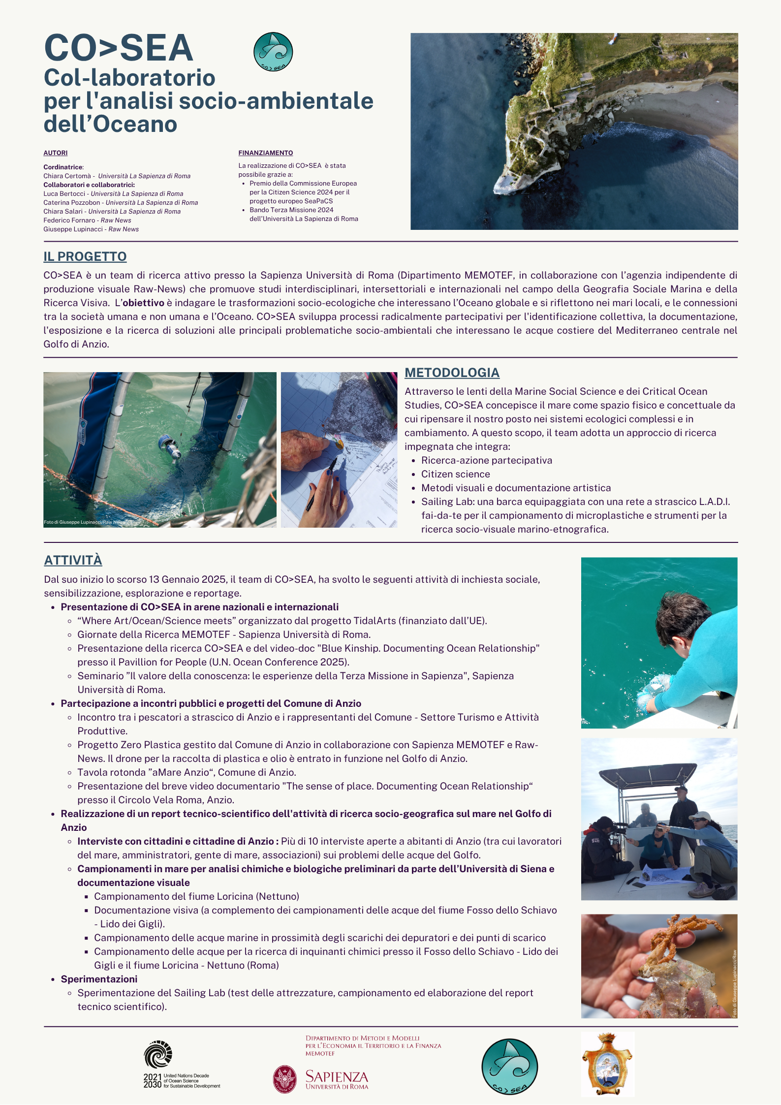 - 20 March 2025 Granted the support to CO>SEA pilot (“Laboratorio Collettivo per il Mare e la Sostenibilità socio-ambientale nel Golfo di Anzio”) by Sapienza University of Rome – Bando Terza Missione 2024 in collaboration with Roberta Gemmiti (MEMOTEF Dep.), Massimo Battaglia (Dep. Management) and Museo della Geografia (see COSea_Lab Terza Missione 2024)