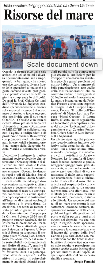 - Certomà, C., Pozzobon, C., Salari, C., Bertocci, L., Boldrini, A., Valente, T., Fornaro, F. (2025), “CO>SEA nel Golfo di Anzio. Report tecnico-scientifico”, Zenodo, https://zenodo.org/records/16313580