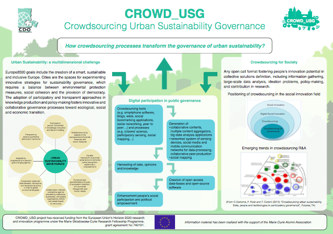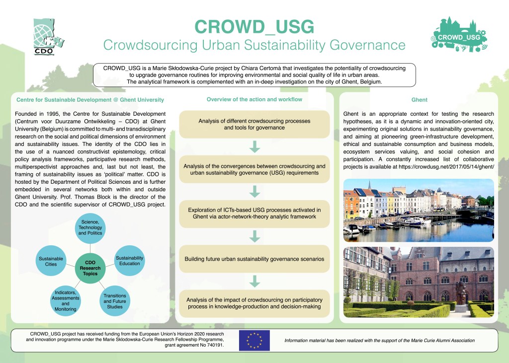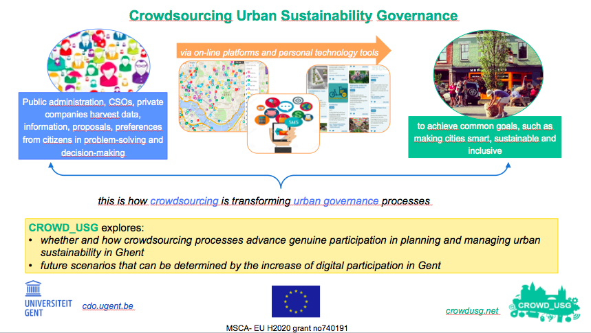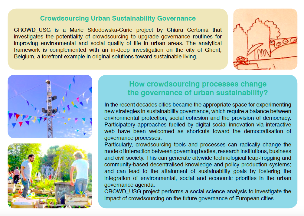 CROWD_USG is a Marie Skłodowska-Curie research project by Chiara Certomà, exploring how increasing ICT-people interactions are transforming the governance of urban sustainability. In this page you will find information about the project, about Chiara Certomà and about the CDO at Ghent University. The official UGent page about the project is here.This information is intended both for citizens and researchers interested in the potential of crowdsourcing for advancing co-creative and participatory innovation networks toward just and sustainable urban development.