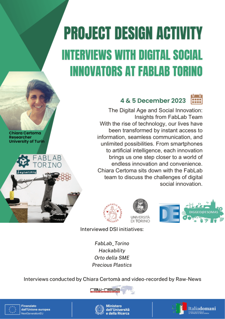 - jun 2025 Now available set DSI photo 1 “Digital Social Innovation in Turin”, cases Orto della SME, Hackability and FabLabTorino, curated by Chiara Certomà, University of Turin and Federico Fornaro, Raw-News ( Photo: G. Lupinacci /Raw-News full reportage on project website).