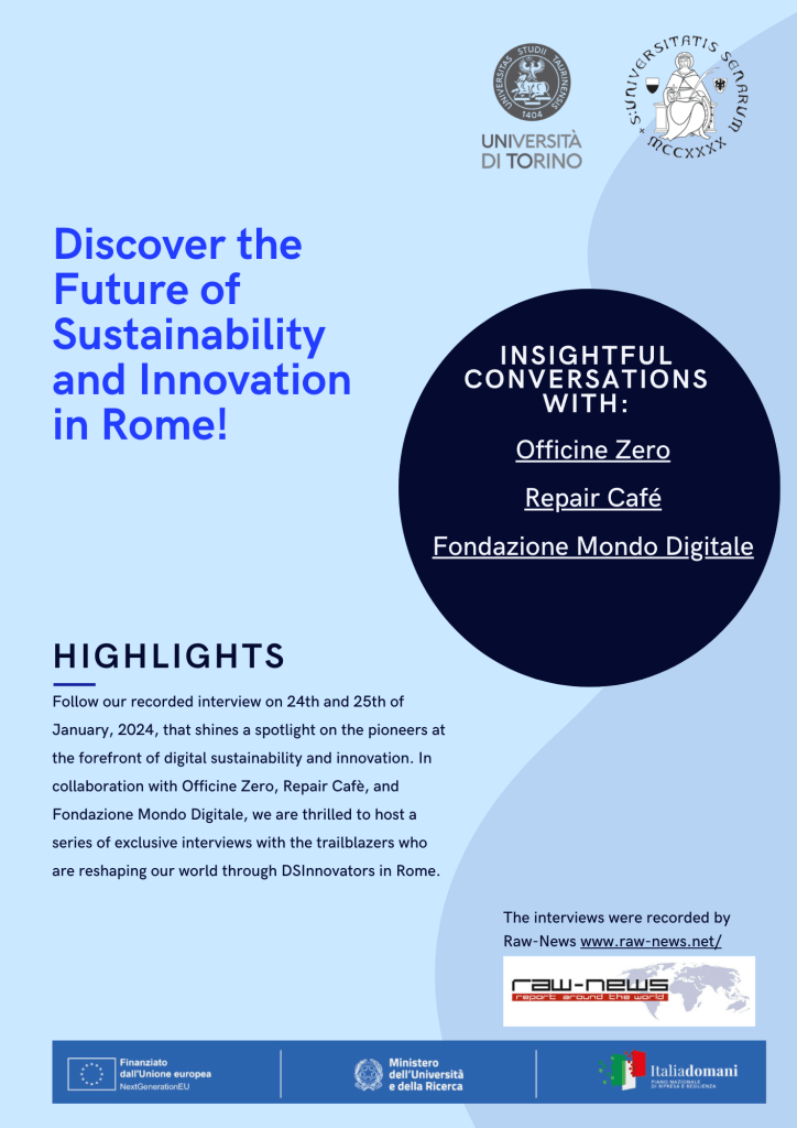 - 24th and 25th of January, 2024 We are thrilled to host a series of exclusive interviews with the trailblazers who are reshaping our world through DSInnovators in Rome. Engage with the minds behind Officine Zero, Repair Café, Fondazione Mondo Digitale as they discuss their groundbreaking work and vision for a sustainable future.