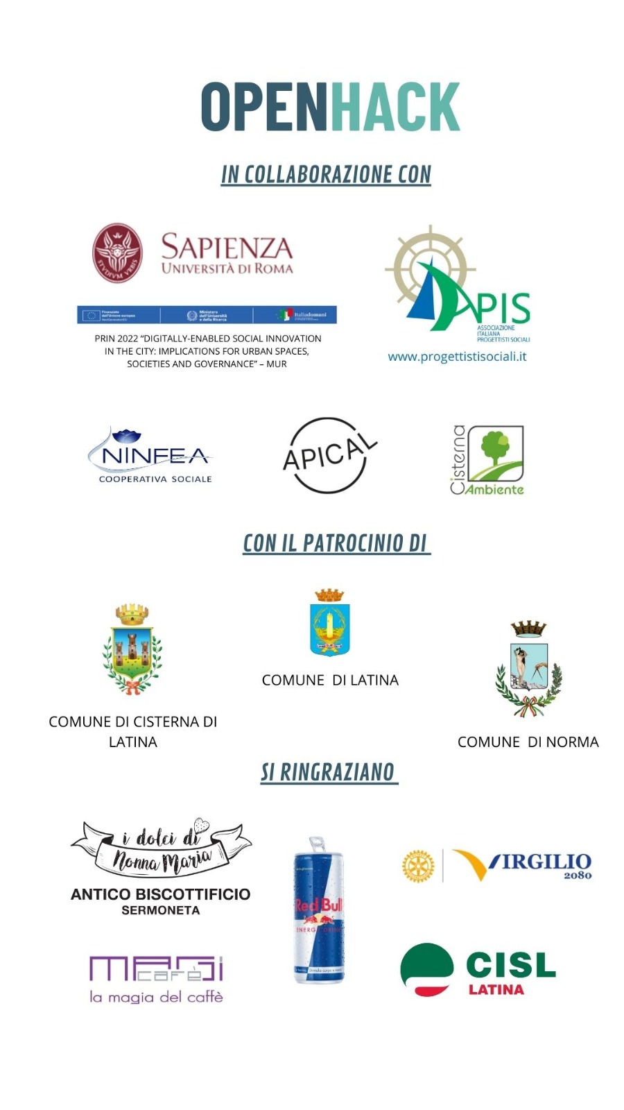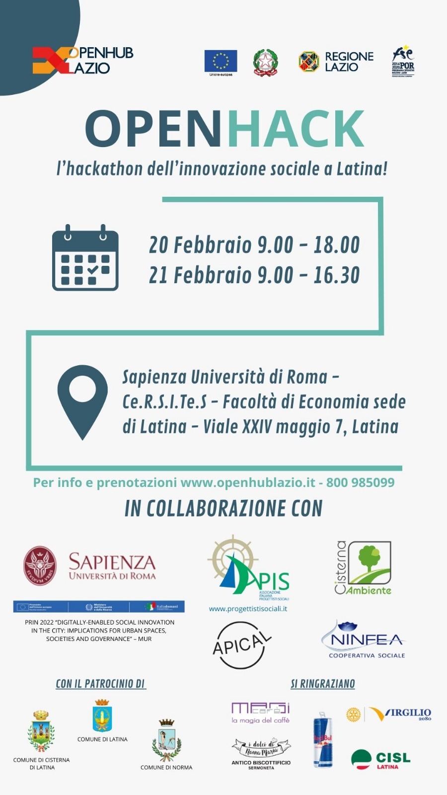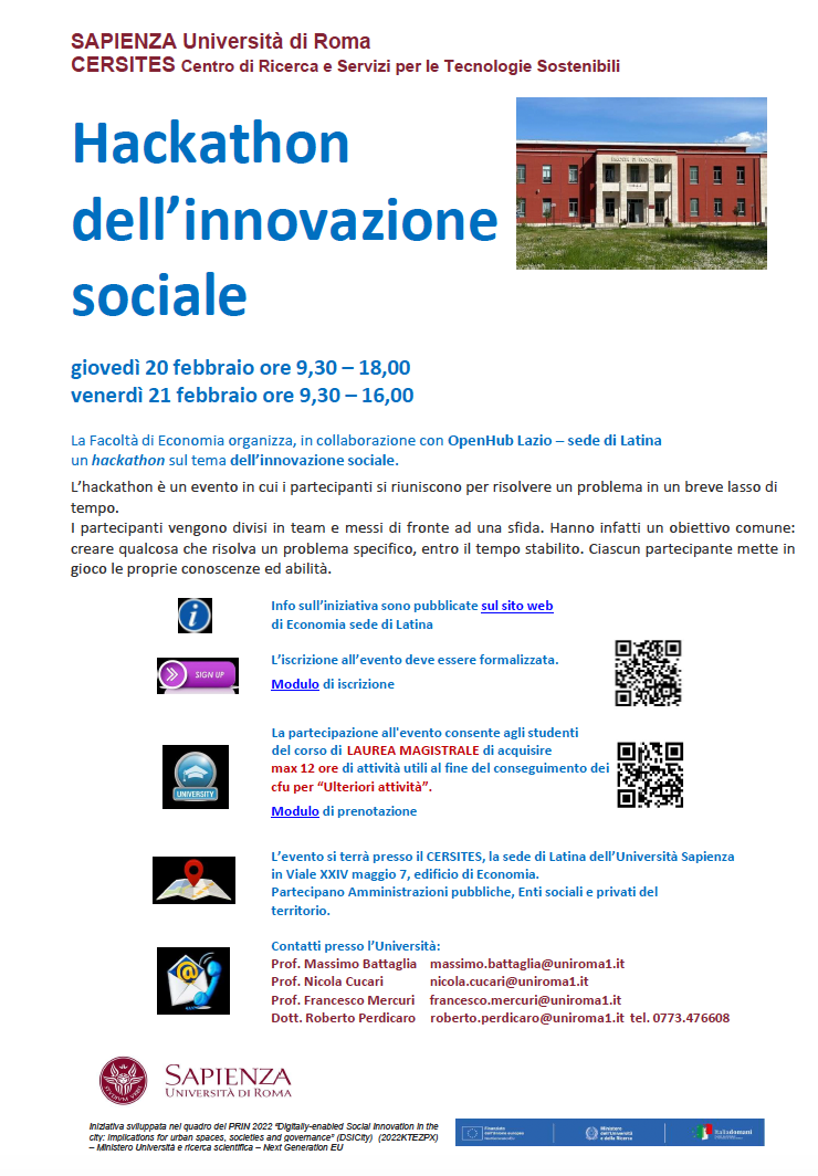 - 21-21 feb 2025 “Hackaton dell’Innovazione Sociale”, Sapienza Univerisity of Rome, Latina