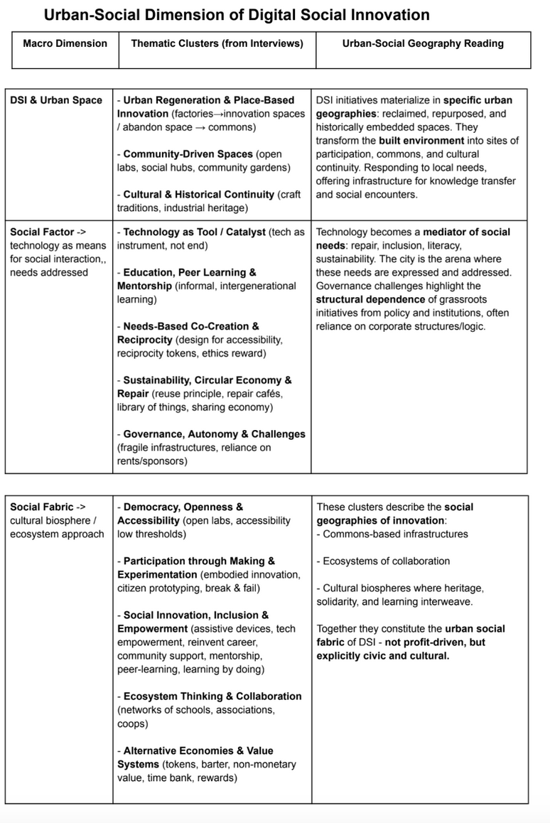 - Nov 2025 Finalised the results of the Literature Analysis & Fieldwork Synthesis. This reading aligns with literature that treats DSI through socio-technical/urban imaginaries materialised in concrete places via governance and in-presence social relationships. The analysis includes the following sub-sections: 1. Urban Space: place-based innovation, neighbourhood scale, augmented place-making; 2. Social Factor: access, learning, participation; technology as instrument; 3. Social Fabric: commons, reciprocity, governance; ecosystem thinking & multi-level commons support; 4. State of the field (2025): hubs, fragments, and weaving together. Available here (restricted access). [below: example of VosViewer bibliometry and via Carrots2]