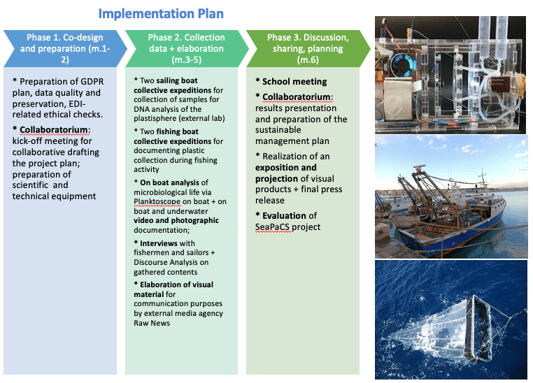 SeaPaCS is intended to raise awareness about the consequences of marine plastic pollution on local biodiversity and to trigger transformative local action for sustainability-oriented behaviours in the coastal small city of Anzio (Rome). It answers two complementary research questions: What microbes are present in the Mediterranean plastisphere (i.e. the living microbial community on plastics and microplastics in marine environments) and how are they affecting the biodiversity of the Mediterranean ecosystem? How can the experience of sea workers and amateurs help decrease plastic debris and promote sustainable behaviours? SeaPaCS combines natural and social science research and engages multiple citizen groups (migrant fishermen cooperatives, students, associations, sailors and divers, scientists, video makers and photographers) in “collaboratorium” meetings, training sessions and co-production of tools for collective sea-going expeditions in the coastal waters (for plastic samples collection, microbial life analysis, interviews and video-documentation of new biological formation and fishing plastic practices), organisation of outreach activities (e.g. video and photo expositions, media coverage, redaction of follow-up plan).