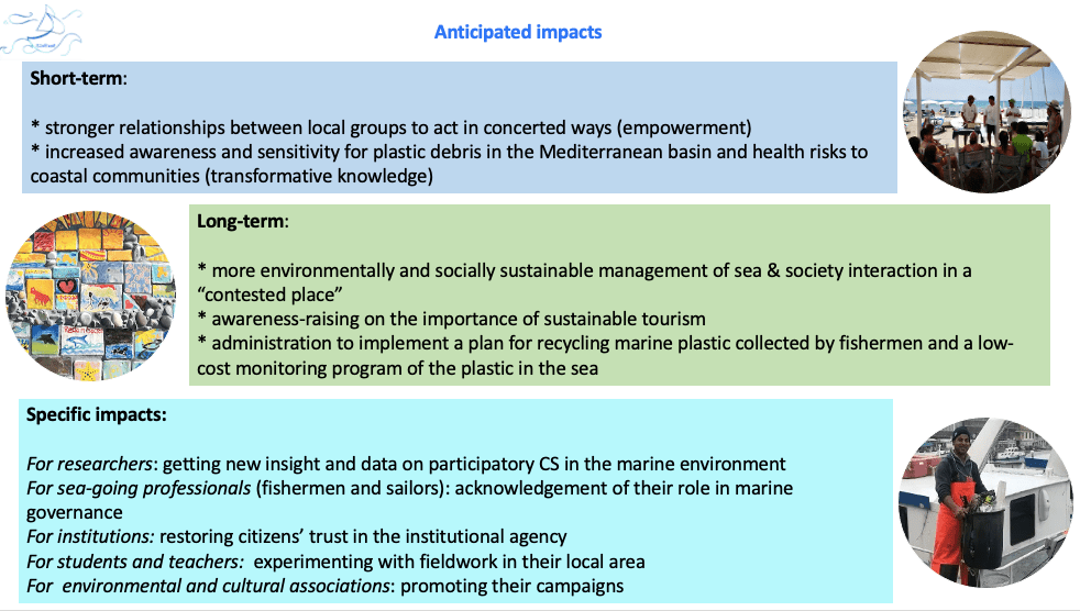 SeaPaCS proposed a participatory citizen science project led by social and natural scientists that mobilises volunteers in data collection, elaboration and sharing on the biological consequences of marine plastic pollution (via in-situ samples collection for plastisphere DNA analysis, underwater video documentation of new ecological niches, plankton evaluation), and in drafting a plan for sustainability-oriented practices based on interviews with fishermen and sailors, in the coastal city of Anzio (Italy) on the Mediterranean Sea. The innovative aspects of the project resided in overcoming the extractive approach in CS (citizens as “sensors”) by promoting a fully participatory process on the EU ACTION project model; advancing a multidisciplinary perspective and methods by combining cultural geography and oceanography; overcoming the problem of inaccessibility of the marine environment for lay citizens thanks to the collaboration with the LNI; tackling locally cogent issues already identified by stakeholders and mobilises their tacit knowledge; feeding the European database on genetic diversity on plastic debris, filling important knowledge gaps worldwide and especially for the Mediterranean Sea. SeaPaCS entailed a co-design phase with citizen, triggered by artistic photos and videos exhibition; the data collection and result elaboration via citizens+scientists-sailors sailing boat expeditions for microplastic collection with a professional Neuston-net labs for genetic and chemical analysis; the collective expedition on a fishing boat for documenting macro-plastic debris trawling and in-depth interviews with fishermen; two working groups on collection and recycling system for marine plastic and protocol for CS that led to a number of follow-up international projects (notably the EU Call Culture Moves Europe “Tentacular Thinking. Experiencing underwater assemblages of culture and nature”; EU NEB “FishArt. Participatory Art for Anzio Fishermen’s Harbour”; the Horizon EU project “PartArt. Participatory Art for Ocean and Water”), scientific outputs publicly available and local initiatives.SeaPaCS multisectoral team specialized in multidisciplinary and radically participatory exploration, documentation and engagement techniques and informal tools to identify contexts-specific matters of concern and, by building on tacit competencies of local actors and multisectorial design skills, attempt at turning these into transformative knowledge for just sustainability. CS communities involved about 70 active members, all age/gender/education/professional/ ethnic status plus about 150 occasional participants (tourists, resident, visitors), 3 institutional stakeholders (Local Administration, Harbour authority, Harbour society) and 3 local enterprises. We created a supporting and proactive social ecosystems via the involvement of CSs (fishermen cooperatives “Fanciulla d’Anzio” and “Concordia”; Sailors Italian Naval League; Students and teachers of 3 local primary and secondary schools, Divers of Scuba Center “Capo d’Anzio”; Surfers of the Surf Beat association; 3 environmental and cultural associations, sea workers, tourist and residents, artists). To this end, we adopted an engagement approach firmly based on visual products not merely as a mean of communication but also as the base for stimulating debate and gathering attention around contested matters of concern, while documenting the entire research process. Moreover we adopted a face-to-face approach by visiting and inviting potentially involved CSs; personal and telephonic communication for about a month to discuss the issue with interested CSs and stakeholders triggered the local engagement. CS that participated in the project increased the number of their social relationships and forged new purpose-oriented alliances as described above. The project largely improved the perception of being able to change a given situation and that his/her action could make a difference in a specific context. The results obtained with the fishermen’s cooperative in cleaning up the harbour are a clear example. The project had an impact on participants’ way of thinking, attitudes and values as many of the participants individually reported a change in their view about the issue of plastic pollution and confirmed this changed the routine. We dedicated special attention to ensuring female presence at least in all of the activities and in the end we have been able to engage a higher number of women than men. The prize will fund the scaling-up of the SeaPaCS participatory methodology in Anzio’s CS community by establishing a Sailing Lab to serve as a socio-scientific collective lab, accessible for scientific and social expeditions at a nominal fee, to democratise ocean CS.